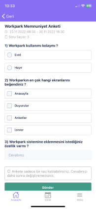 Duyuru, Anket ve Dokümanların kategorize edilerek tek tuşla anlık olarak tüm çalışanların telefonuna bildirim olarak gönderilmesini sağlar.